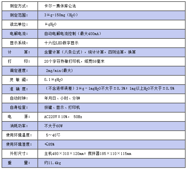 儀器符合GB/T7600;SH/T0246;GB/T606及采用卡爾—費休法測定樣品中水分的有關標準。 儀器采用了先進的自動控制電路,電解電流自動跟蹤控制,外型結構新穎,從而使該儀器工作更可靠,使用更方便,具有分析速度快(一分鐘出結果)、操作簡便、精度高、自動性強等特點,同時具有自動打印功能,可將實驗結果、做樣時間、樣品編號自動打印出來,廣泛應用于石油、化工、電力、鐵路、環保等部門。