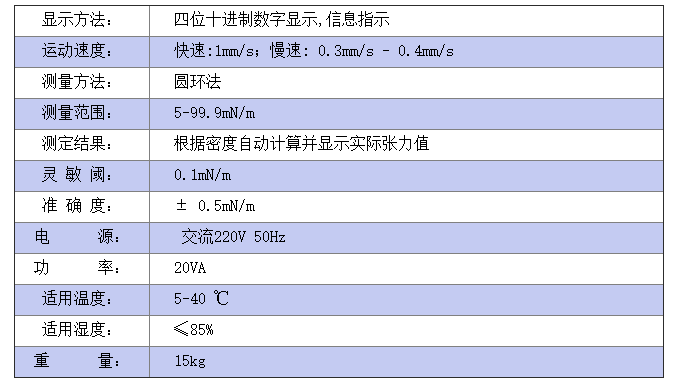 儀器符合GB/T6541的標準,采用圓環法在非平衡的條件下測量各種液體表面張力(液—氣相界面)及礦物油與水的界面張力(液—液相界面)。該儀器采用了微處理技術,自動化程度高、操作簡便、工作可靠。被測樣品注入杯后,只要按動啟動鍵,儀器便可自動完成對試樣的測量,并能自動根據輸入的具體參數計算出被測試樣的張力值。